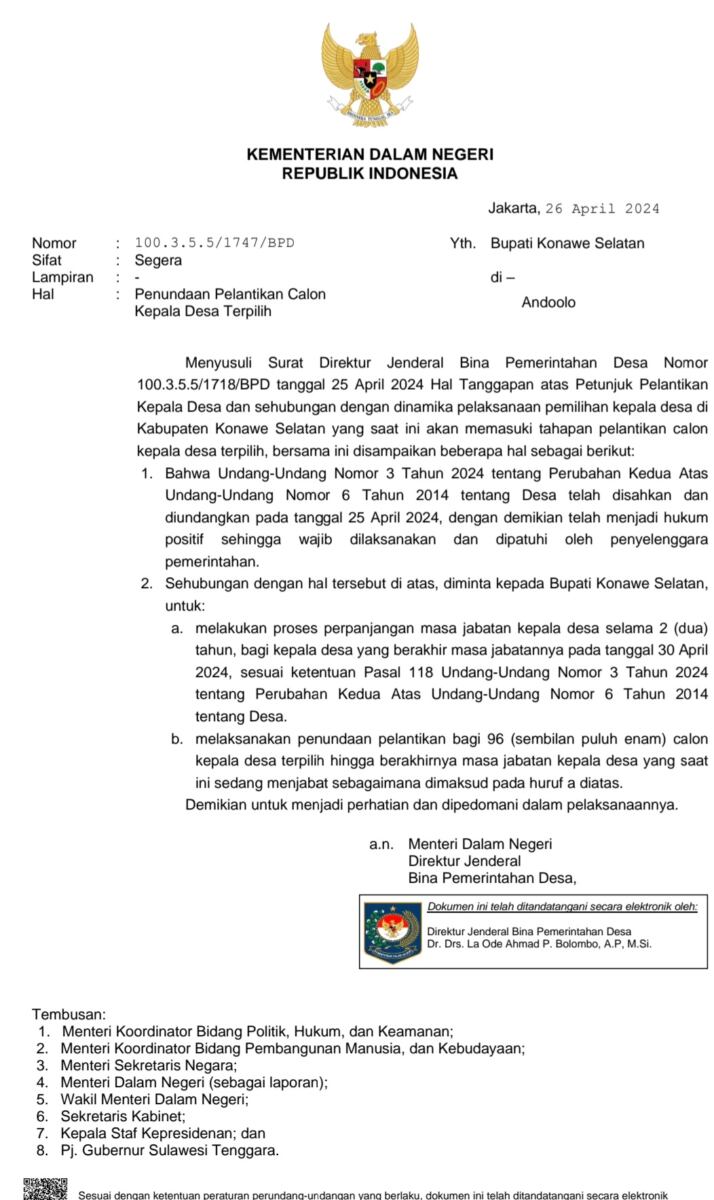 Dalam surat yang di tunjukkan kepada Bupati Konawe Selatan tersebut menegaskan bahwa Undang-Undang Nomor 3 Tahun 2024 tentang perubahan kedua atas Undang-Undang Nomor 6 Tahun 2014 tentang Desa telah di sahkan dan diundangkan pada tanggal 25 April 2024, dengan demikian telah menjadi hukum positif sehingga wajib dilaksanakan dan di patuhi oleh penyelenggara Pemerintahan, berkenaan hal tersebut pada poin a surat tersebut meminta Pemkab Konawe Selatan melakukan proses perpanjangan masa jabatan kepala desa selama 2 Tahun bagi Kepala Desa yang berakhir masa jabatannya pada tanggal 30 April 2024, sesuai ketentuan pasal 118 Undang-Undang Nomor 3 Tahun 2024 tentang perubahan kedua atas Undang-Undang Nomor 6 Tahun 2014 tentang Desa dan poin b melaksanakan penundaan Pelantikan bagi 96 calon kepala desa terpilih hingga berakhirnya masa jabatan kepala desa yang saat ini sedang menjabat sebagaimana yang tertera pada poin a.