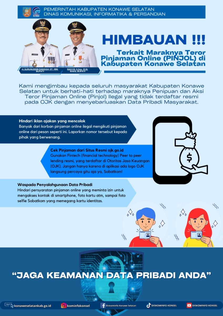 Dalam himbauan, Pemkab Konawe Selatan meminta seluruh masyarakat Konawe Selatan untuk berhati-hati atas maraknya penipuan dan aksi teror pinjol yang tidak terdaftar resmi di Otoritas Jasa Keuangan (OJK) dengan menyebarluaskan data pribadi masyarakat.