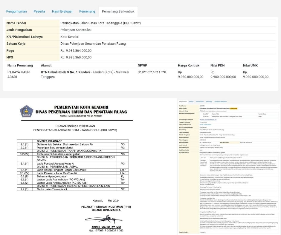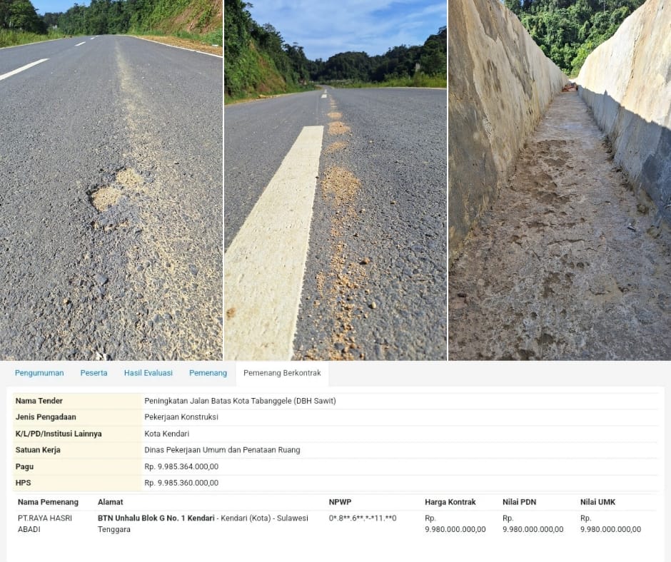 Proyek Dinas PU kota Kendari yang dimaksud adalah proyek Peningkatan Jalan Batas Kota – Tabanggele yang diduga Mark Up dan tidak sesuai Spesifikasi.