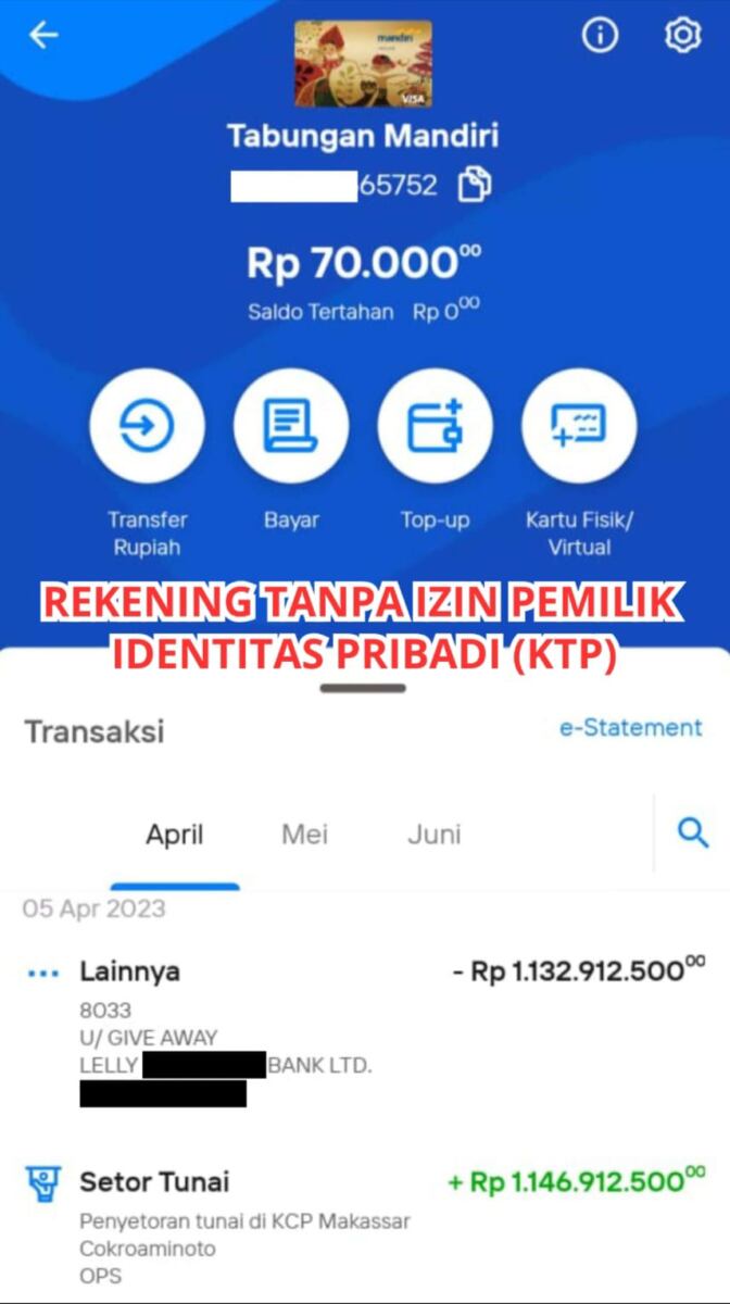 Rekening tanpa izin tersebut ini di temukan melalui aplikasi Livin by Mandiri pada Mei 2023 lalu. Rekening yang dibuka pada 5 April 2023 itu mencatat transaksi setoran tunai dan transaksi signifikan atas nama Lelly U, yang diduga istri dari pemilik PT. WIN.