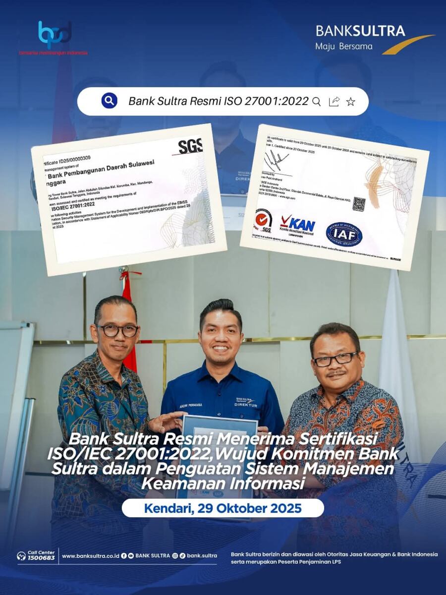 “Perolehan sertifikasi ISO/IEC 27001:2022 ini merupakan bentuk nyata komitmen Bank Sultra dalam menjaga dan meningkatkan keamanan informasi di seluruh lini operasional kami. Di era transformasi digital yang semakin cepat, keamanan data bukan hanya kewajiban teknis, tetapi juga amanah moral kami kepada seluruh nasabah mitra dan pemangku kepentingan.