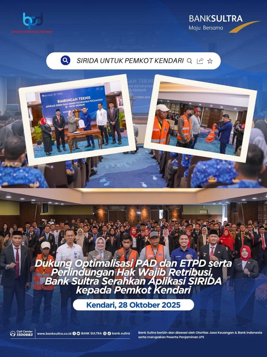 Kodesultra.id, Kendari – Bank Sultra secara resmi menyerahkan Aplikasi Sistem Informasi Retribusi Daerah (SIRIDA) kepada Pemerintah Kota Kendari. Serah terima ini dilakukan langsung oleh Direktur Utama Bank Sultra, Andri Permana Diputra Abubakar, kepada Wali Kota Kendari, Dr. Hj. Siska Karina Imran, bertempat di Gedung Bank Indonesia Sulawesi Tenggara.
