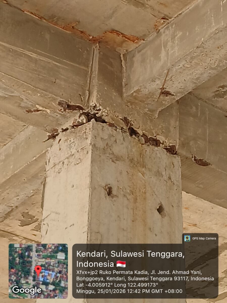 Terdapatnya Beton berongga (honeycomb) dan tulangan terlihat mengindikasikan ketidaksesuaian mutu pelaksanaan.