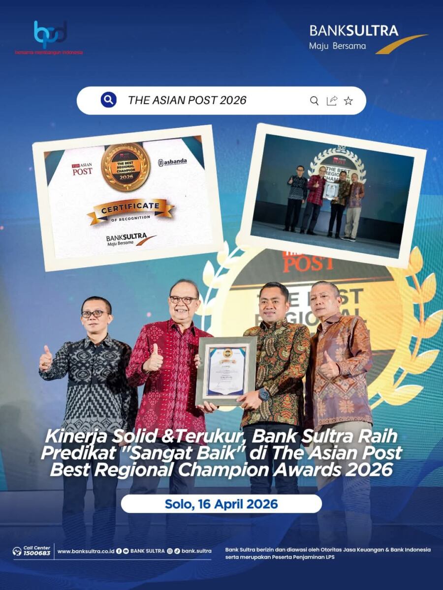 Kodesultra.Id, SOLO– Bank Sultra kembali mengukuhkan eksistensinya sebagai lembaga keuangan daerah yang tangguh dengan meraih penghargaan sebagai Bank Pembangunan Daerah (BPD) berkinerja “Sangat Baik Tahun 2025” pada kategori KBMI 1 dalam ajang bergengsi The Asian Post Best Regional Champion Awards 2026.
